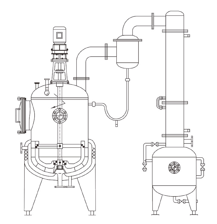 加料采用真空加料,所以使用時(shí),開啟真空泵同時(shí)開啟進(jìn)料閥,罐內(nèi)液面為了保證一定的蒸發(fā)空間,擬與筒體視鏡相近為宜。關(guān)閉加料閥門后即可打開夾套蒸汽閥門,使罐內(nèi)料液適度沸騰,開始蒸發(fā)。為了加快速度,采用減壓濃縮,其真空度的高低由用戶的不同要求自定。