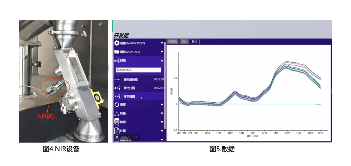 如圖4所示,在連續混合機出料口的NIR設備,可實時監控混合過程中API與輔料的混合均勻度及水分含量,并且數據可以直觀顯示(圖5)。