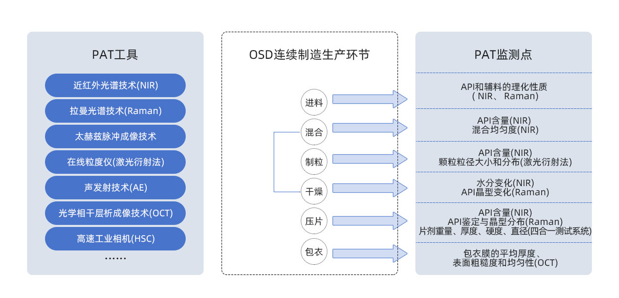 目前應用最廣泛的PAT檢測技術是近紅外光譜(NIR)和在線激光粒度儀。圖2展示了OSD生產中常見的PAT工具和具體應用場景。